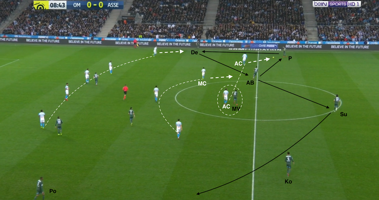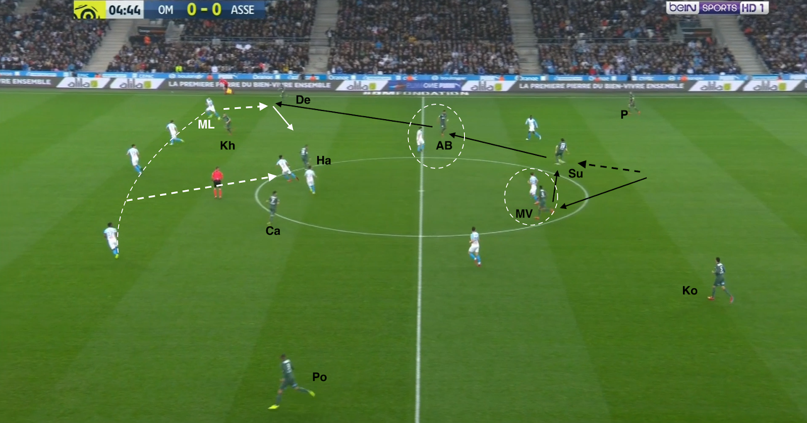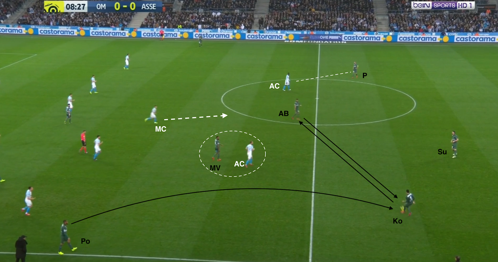 "Son" avant-centre reste à côté de Kolo pendant que l'autre est discipliné et s'en va chercher Perrin, ce qui libère un angle de passe vers Aït Bennasser. M'Vila est recherché par un milieu axial, ce qui permet aux Stéphanois de trouver Cabella et Polomat à gauche - dans deux passes les deux premières lignes du bloc marseillais ont été franchies. Cabella laisse le ballon aller vers le côté et fait un appel dans l'axe :
