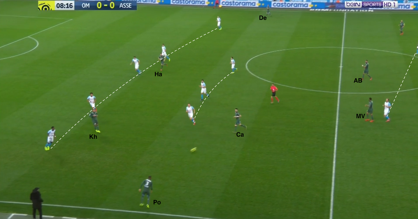 Défense à 5 pour contenir les deux avant-centres et les deux joueurs de couloir. Marquage individuel entre les milieux axiaux, mais aussi d'un avant-centre marseillais sur M'Vila pendant que l'autre cherche Perrin. La construction des Verts doit donc passer par une prise de risque, par des passes vers des joueurs suivis de près par un adversaire :