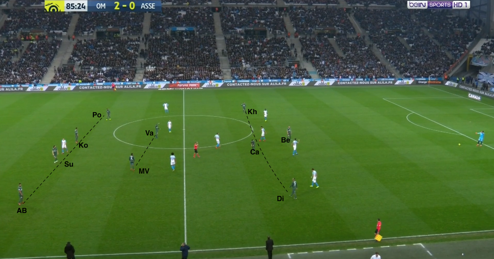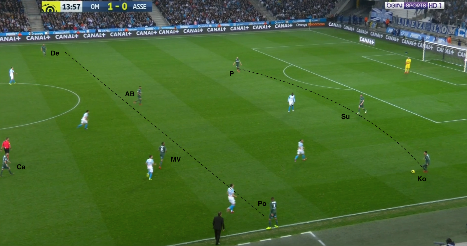 Le 5-2-3 stéphanois est bien visible, tout comme l'utilité d'une défense à 5 : les Marseillais attaquent en 4-2-4. Polomat sort de l'alignement pour bloquer le couloir, Kolo coulisse pour couvrir dans son dos et récupère le ballon qui arrive à M'Vila :