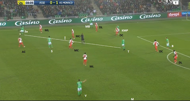 Comme les Monégasques défendent avec deux lignes de 4, sans sentinelle, il y a un espace entre les lignes. Les Verts jouent sans un "10" traditionnel, mais il était dommage de ne pas profiter de cet espace. Si en seconde période c'est Saivet qui l'a plutôt occupé (notre équipe ressemblant plus à un 4-2-3-1), en première mi-temps c'est notre faux milieu excentré Tannane qui l'a fait, comme dans cet exemple pris à la 8ème.