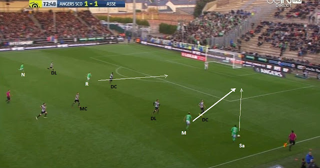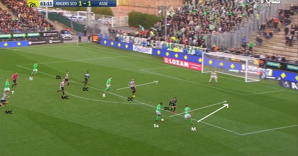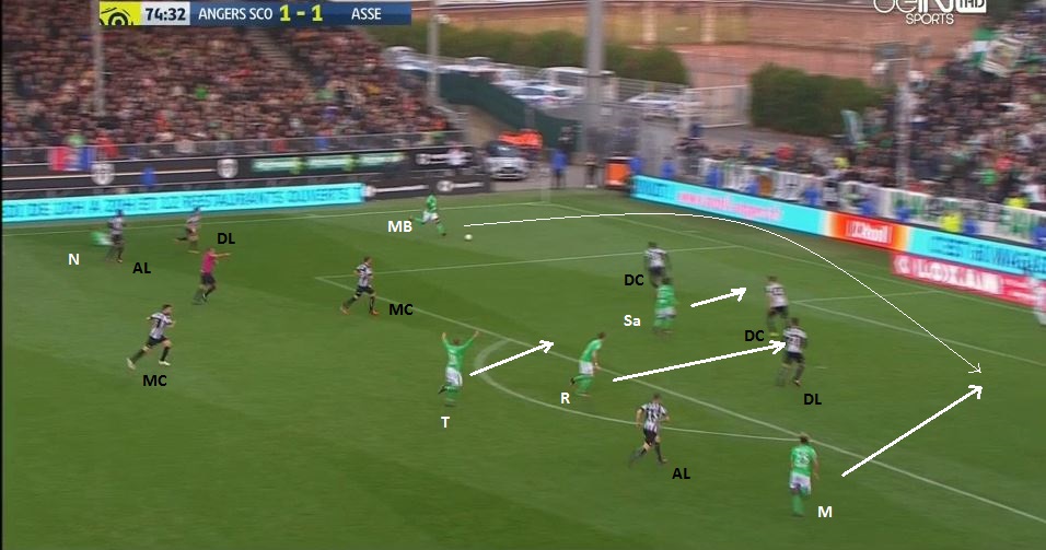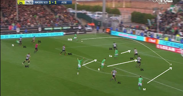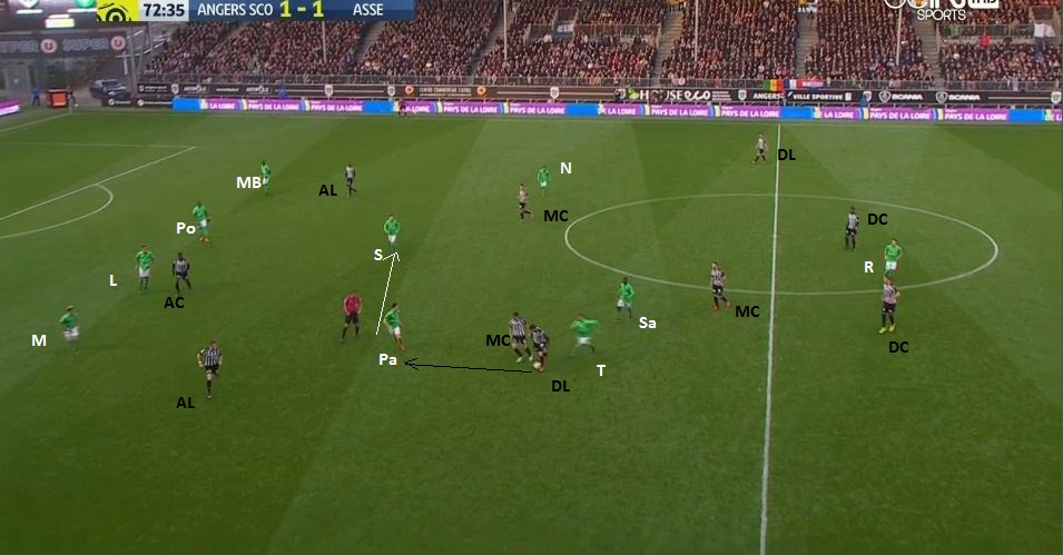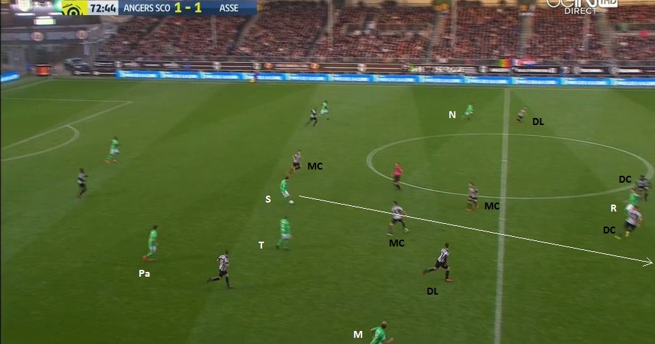 On compte en ce moment 5 Angevins pour 6 Stéphanois, dont Saivet bien démarqué et Malcuit qui arrive dans son dos. Il est évident comment il faut jouer la suite :