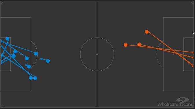 Si on regarde donc le match à Bastia dans son ensemble, les chiffres donnent une domination nette et sans appel des Verts. Non spécialement en terme de possession de balle - 63% pour nous - mais surtout en terme de dangerosité. Si on regarde les tirs effectués dans le jeu (et non suite à des CPA) par les deux équipes (l'ASSE en bleu, Bastia en orange) :