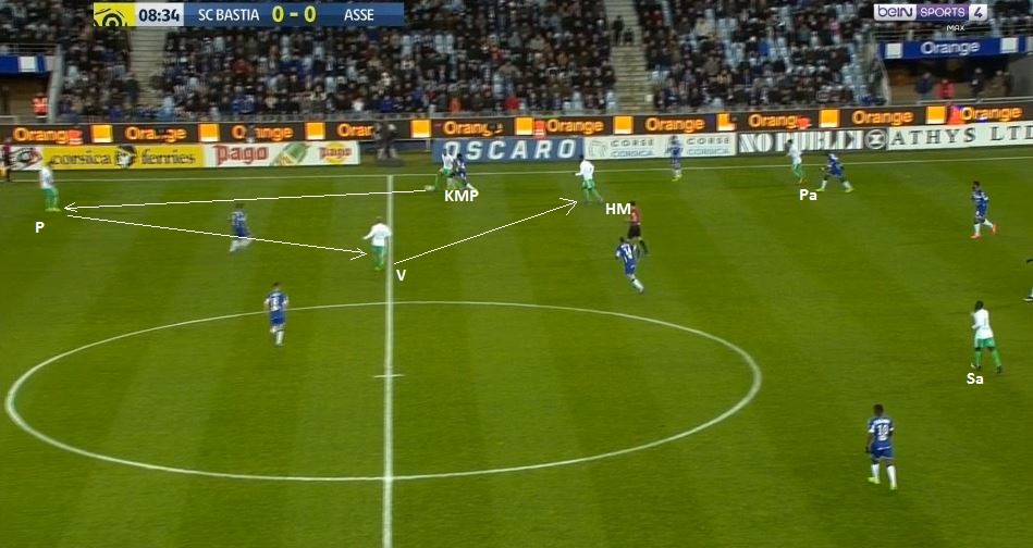 KMP garde le ballon, pendant que Maiga lui offre une solution et que Pajot se projette dans le couloir en ailier, mais il finit par rejouer avec Perrin en arrière. Le ballon est de nouveau remonté via Veretout jusqu'à Maiga dans le couloir :