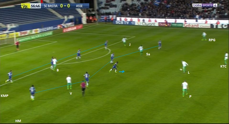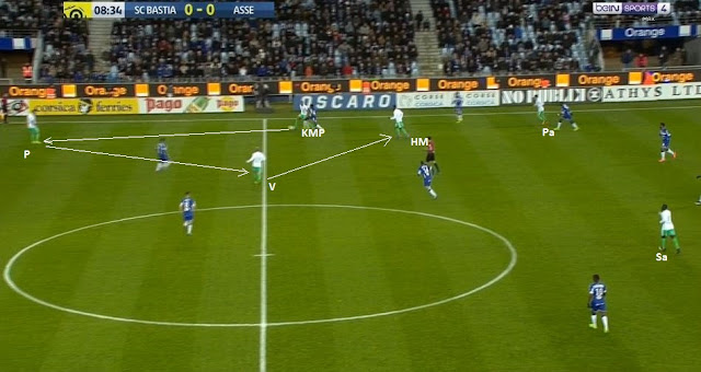 Si la période en supériorité numérique n'a pas donné grande chose, il faut essayer de comprendre comment le match a été abordé, quel a été le plan de jeu initial. Par rapport à la semaine dernière, cette fois-ci l'adversaire avait été étudié et des points faibles identifiés, selon Galtier en conférence de presse. La tactique stéphanoise a été basée sur une bonne possession accompagnée d'une récupération rapide et parfois très haute, ainsi que des tentatives de déjouer le hors-jeu recherché par la défense Corse (avec de la réussite pour KMP, beaucoup moins pour Beric). Mais le point faible adverse n'était pas là, il était sur le positionnement des milieux axiaux adverses lors des centres.