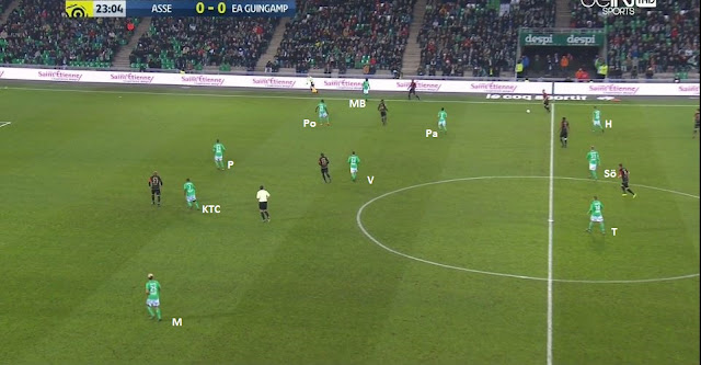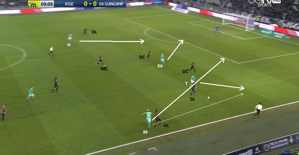 Le un-deux entre Malcuit et Tannane fonctionne parfaitement et à eux deux ils ont pris 4 adversaires : deux défenseurs éliminés pas la passe de Tannane, l'ailier qui suit Malcuit et la sentinelle qui doit couvrir :