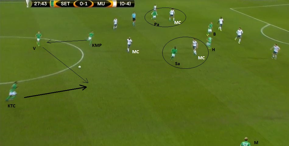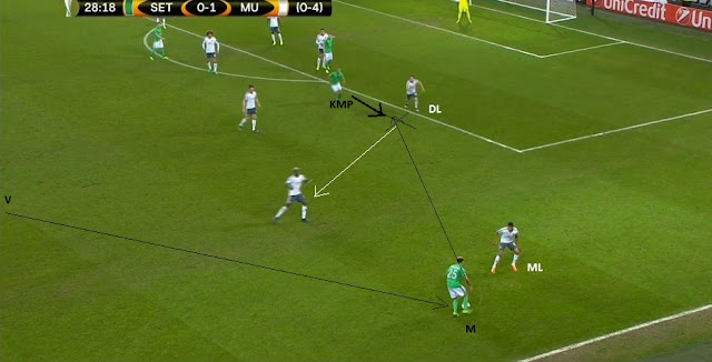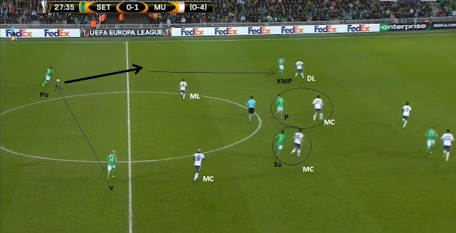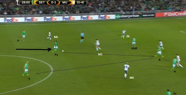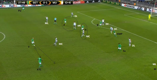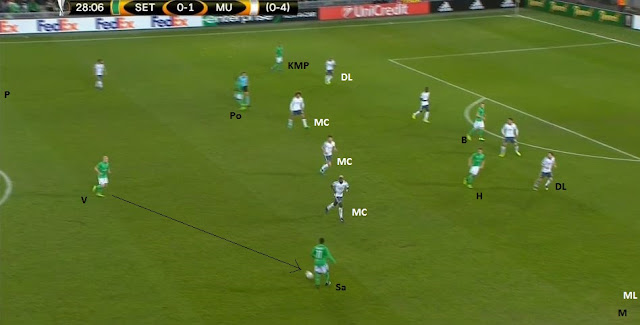 Lors de cette action on a pu voir comment l'axe du terrain était bien contrôlé par les milieux axiaux adverses, très en bloc, très disciplinés, qui empêchaient le jeu vers les attaquants. Dans ce contexte, la question qui se pose est pourquoi on n'a pas écarté sur les côtés, pourquoi on n'a pas étiré le bloc adverse, ces trois milieux, histoire de créer de la place entre eux ? Il est probable que c'est pas nos joueurs qui n'ont pas voulu le faire, mais qu'ils ont été "poussés" vers l'axe par l'adversaire - Perrin le reconnaissant à mi-mots après le match. Si on regarde rapidement une autre attaque, une grosse dizaine de minutes plus tard, le jeu est envoyé de la droite vers la gauche, de Malcuit, en passant par Veretout, KTC et Pajot, jusqu'à Pogba :