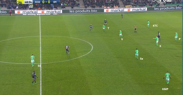 Comme contre Angers le début du match n'est pas favorable aux Stéphanois qui ratent tout ce qu'ils essaient offensivement et qui sont plutôt fébriles défensivement. On a clairement un problème à bien défendre sans une sentinelle contre une équipe qui a la possession du ballon. A la différence du match précédent, on arrive à la pause sans être menés au score grâce aux parades de Ruffier (4 tirs cadrés de la surface, dans le jeu, pour Marseille... 0 pour nous).