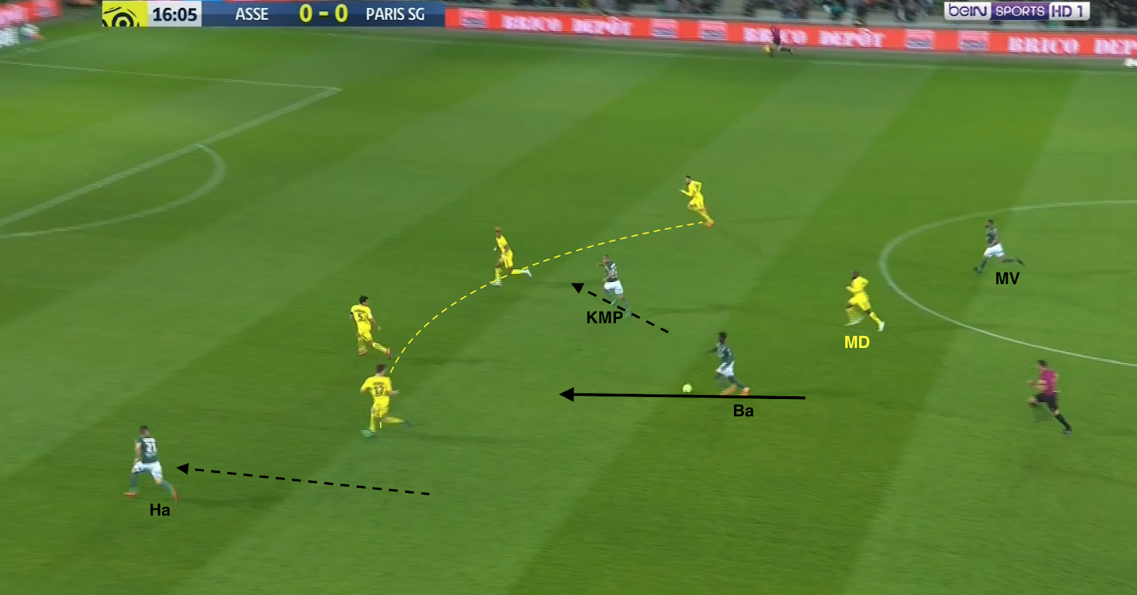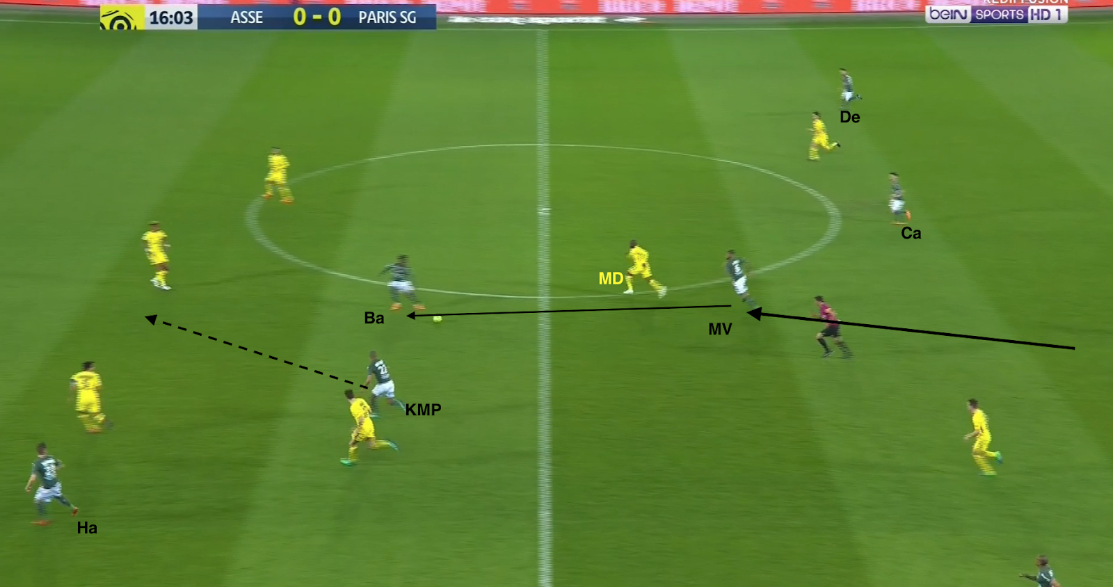 Les 5 Parisiens (tous sauf les 4 défenseurs) essayent d'enfermer les Stéphanois, pendant que M'Vila, complètement seul sur son côté gauche, fait des grands gestes pour demander le ballon. Il le reçoit via Selnaes, servi par Ruffier malgré le pressing adverse, et le donne ensuite à Cabella. Les Verts ont un grand espace à leur disposition et ils en profitent :