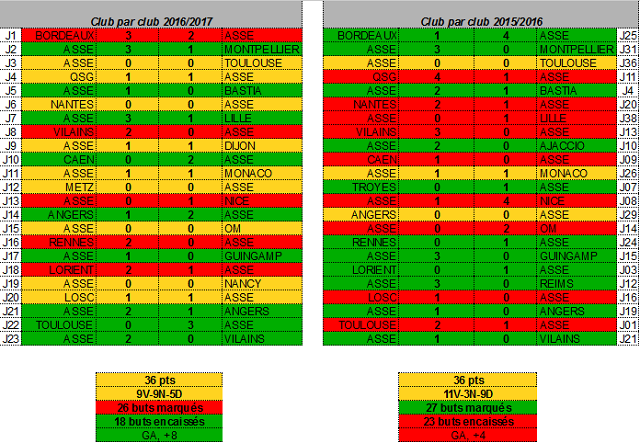 Si le classement brut est favorable aux Verts par rapport à la saison passée, il n'en va pas de même dans le Club par Club où la situation est équivalente, ce qui constitue déjà une progression sur ce début d'année civile sur le débours de 4 points à la mi-saison. Le tout grâce à une équipe plus solide concédant moins de buts et de défaites.