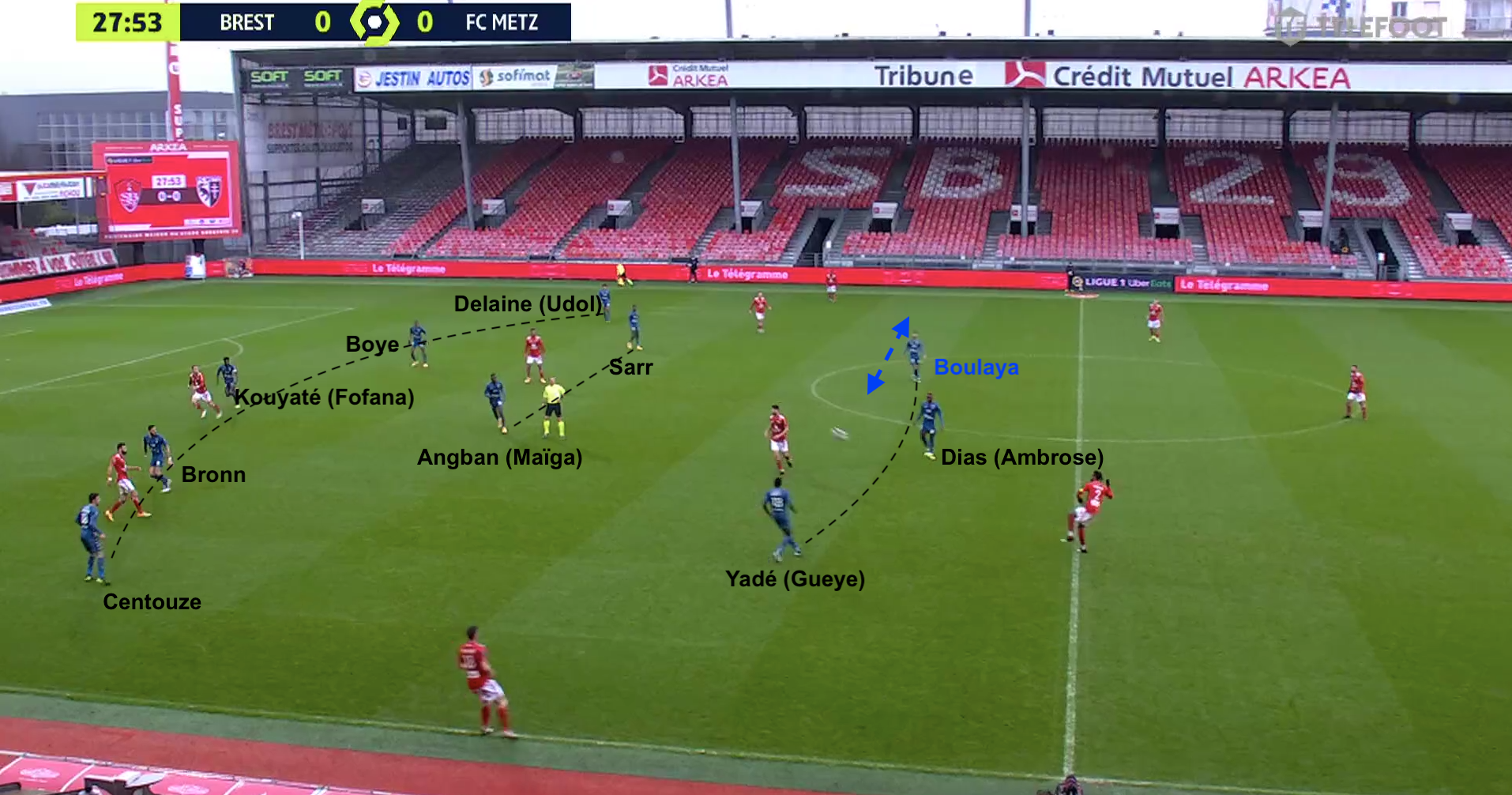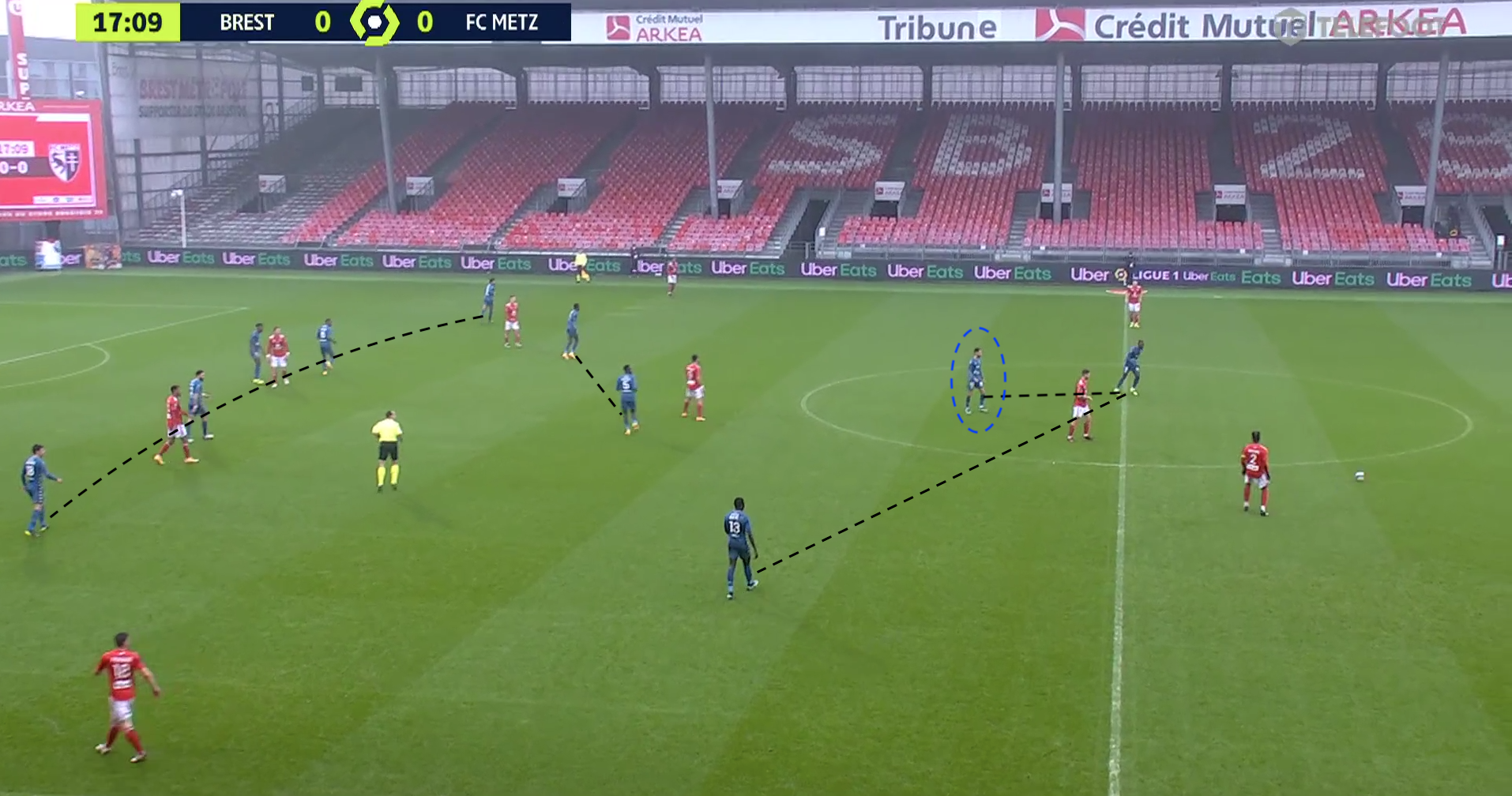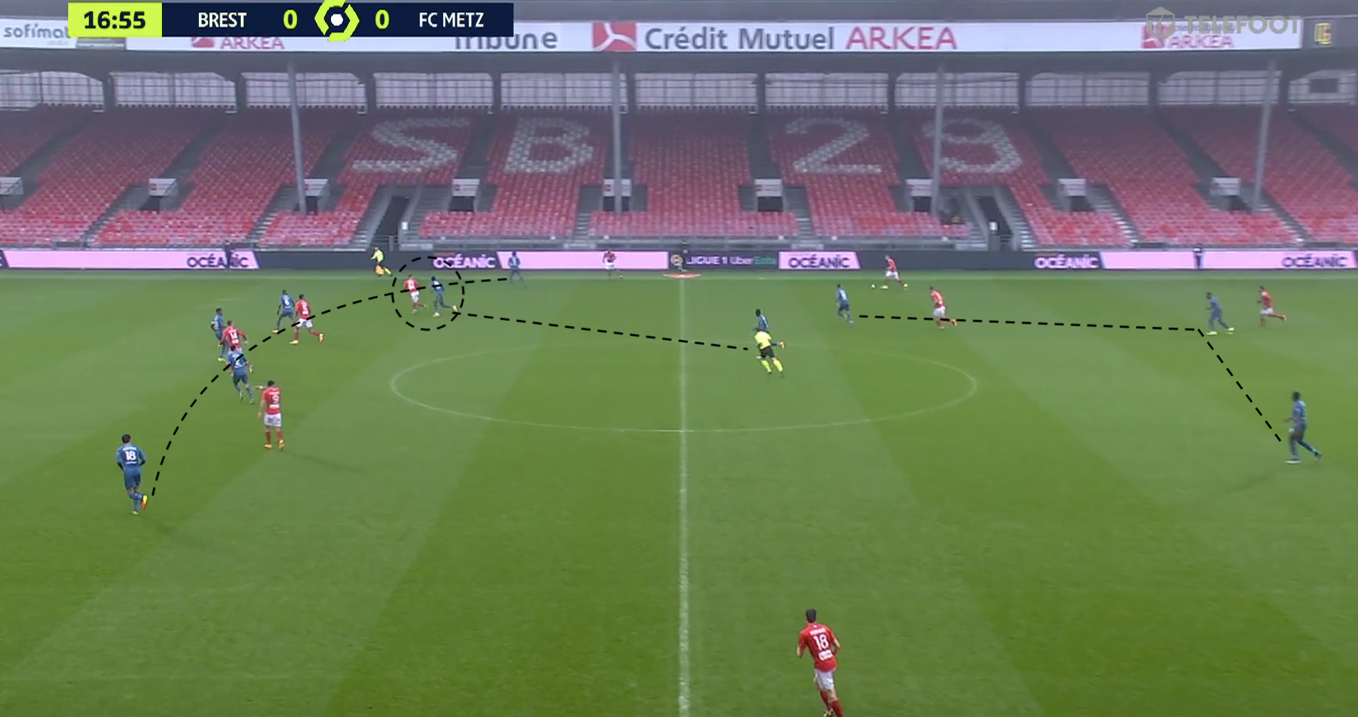 Dans cet exemple, un milieu messin sort pour être au marquage d'un brestois et il le colle jusqu'au moment où l'autre milieu quitte sa zone pour suivre un autre adversaire, qui s'était projeté dans la défense :