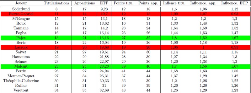 Le tableau suivant classe ces 18 joueurs par ordre croissant suivant leur Equivalent Temps Plein (ETP), soit le nombre total de minutes jouées divisé par 90. Petit mot de méthodologie : nous regroupons dans les dernières colonnes trois indicateurs différents. Le premier correspond au nombre de points pris par l'ASSE lorsque le joueur est titularisé, divisé par le nombre de titularisations. Le deuxième l'ensemble des points pris lorsque le joueur participe sur le terrain, divisé par le nombre d'apparitions. Enfin le troisième, qui nous semble plus enclin à mesurer l'influence réelle du joueur, est un peu plus compliqué : à chaque match auquel le joueur participe, nous prenons le nombre de points pris par l'équipe et le multiplions par le temps de jeu du joueur sur ce match ; en faire la somme pour chaque apparition et diviser par le nombre total de minutes jouées au cours de la saison nous donne ce dernier indicateur. Enfin, nous précisons que la seule source retenue nous vient du site de la Ligue qu'on adule.