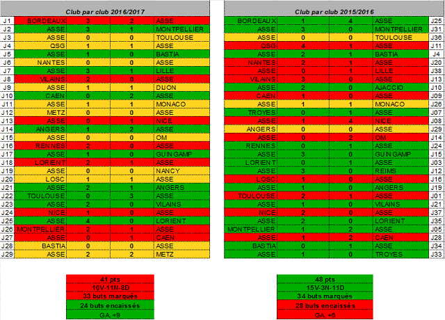 C'est très largement, maintenant, à la suite de performances très décevantes, que les résultats de cette saison sont inférieurs à ceux de la saison passée. Il n'y a pas moins de 7 points d'écart avec notamment 5 victoires en moins. Seul la défense et la différence de but restent positives cette saison.
