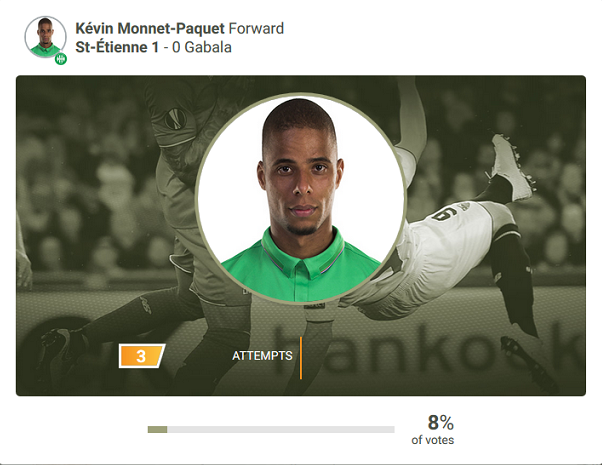 Déjà étonnement présent parmi les 8 nommés, à la suite d'un match correct, mais qui ne restera pourtant pas dans les annales, Kévin Monnet-Paquet termine à la 3ème place du classement, derrière Dani Quintana de Qarabag et Ibarbo du Panathinaikos, avec 8% des votes, et devance ainsi le petit frère de Florentin, Paul Pogba, ou encore Candreva ou Konoplyanka.