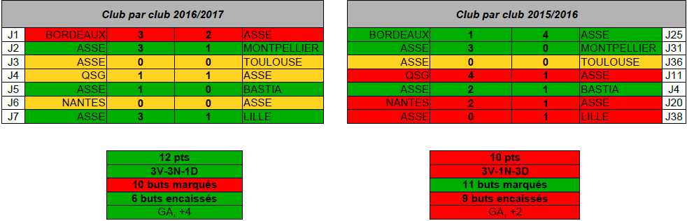 La L1 est repartie, ses classements alternatifs aussi. Parmi ceux-ci, les potonautes sont attachés à celui du Club par Club, comme l'atteste le sujet lancé par Stef sur le forum. On remarque donc que si les Verts sont loin derrière leur début de saison 2015-2016 au calendrier brut (16 points pris sur les 7 premières journées l'an dernier), ils ont obtenu de meilleurs résultats contre leurs 7 premiers adversaires ; les points pris à Paris, Nantes et contre Lille compensant largement ceux perdus à Bordeaux. Dans le détail :